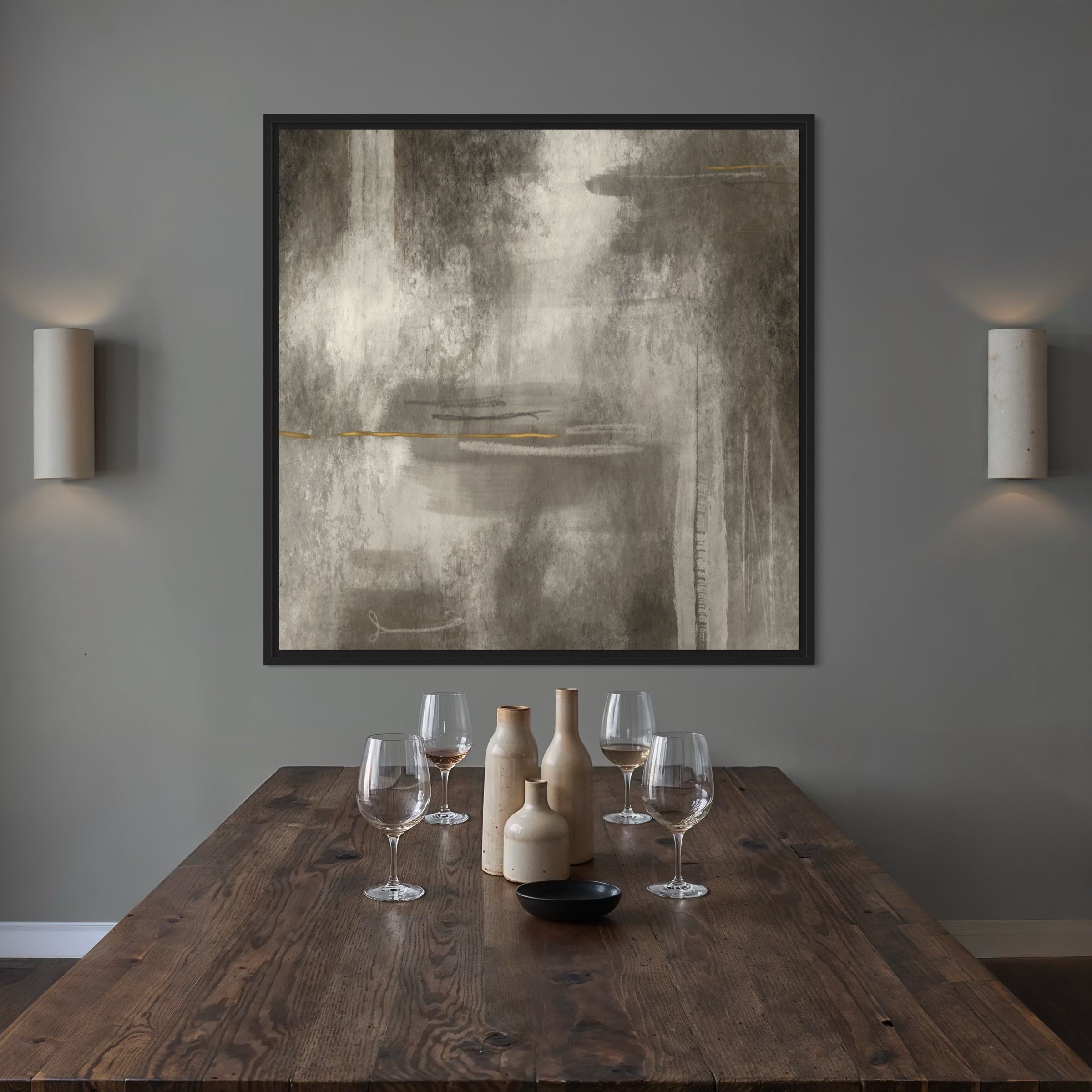 This piece features greige, taupe, stone grey, charcoal, chalky white, and antique gold.